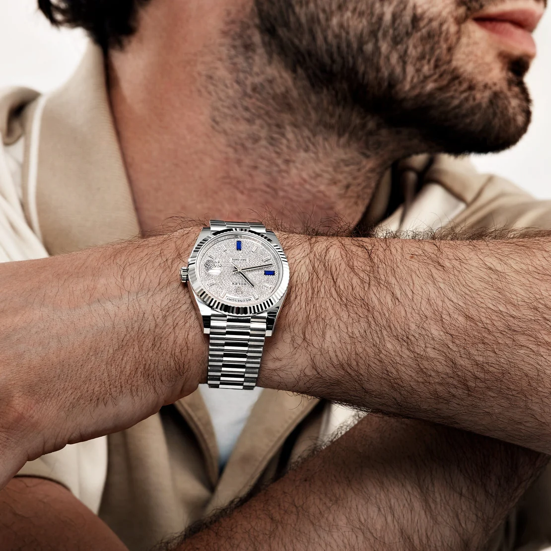 • Dial: Exquisite pavé diamond dial with meticulously set brilliant-cut diamonds; day aperture at 12 o’clock and date window at 3 o’clock beneath the Cyclops lens.