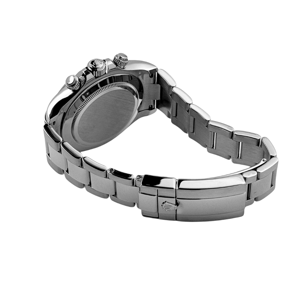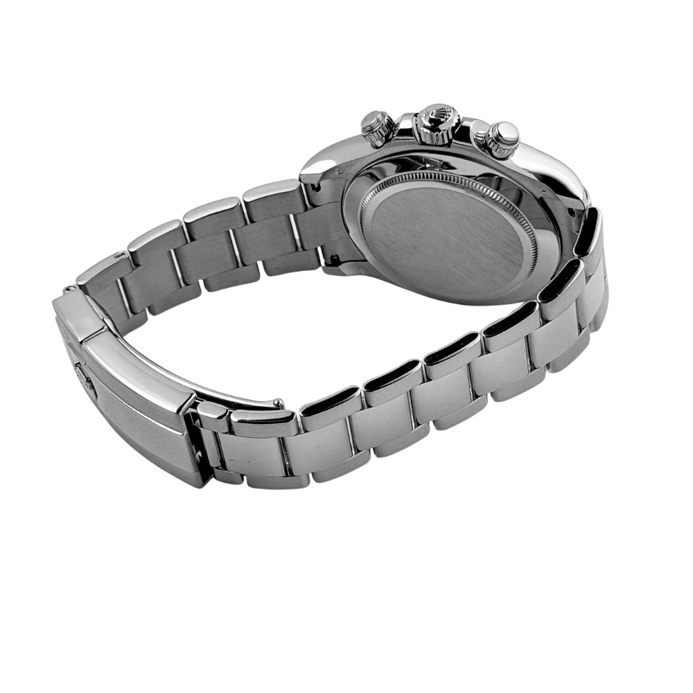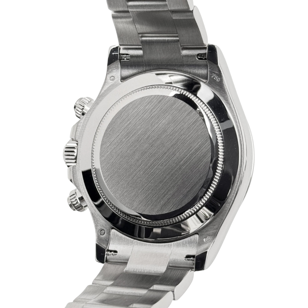 The Rolex Cosmograph Daytona Ref. 116509 is a testament to Rolex’s mastery of both design and precision engineering. Crafted from 18 ct white gold, the 40 mm Oyster case is waterproof to 100 meters and features an integrated solid gold tachymeter bezel, allowing the measurement of average speeds up to 400 units per hour. The blue sunburst dial—one of the most coveted colorways in modern Daytonas—displays red “Daytona” lettering and matching red chronograph hands, giving it a dynamic, contemporary aesthetic. The trio of sub-dials (running seconds, 30-minute, and 12-hour counters) provides precise chronograph functionality, driven by the robust in-house Calibre 4130 movement. Introduced in 2000, the Calibre 4130 remains one of the finest automatic chronograph movements ever made, featuring a vertical clutch and column wheel for smooth chronograph operation. Its blue Parachrom hairspring ensures resistance to shocks and magnetic fields, while its 72-hour power reserve provides lasting reliability. The Daytona 116509 comes on a solid Oyster bracelet in matching 18 ct white gold, fitted with the Oysterlock safety clasp and Easylink comfort extension system. Combining understated luxury with motorsport performance, this reference is a modern Rolex icon sought by collectors and connoisseurs worldwide.