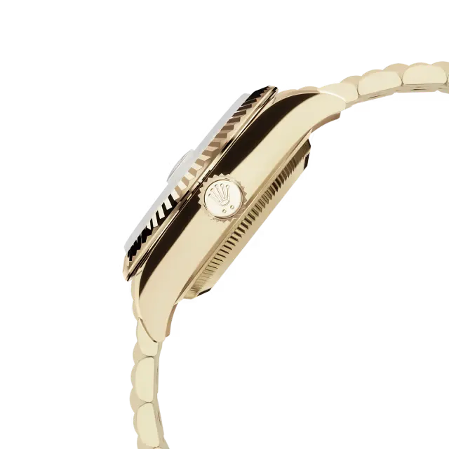The 28 mm Oyster case crafted from Rolex’s high-grade 18 ct yellow gold envelopes the subtle champagne dial, which shines with diamond-set hour indexes framed in gold. The fluted bezel reflects light delicately, while the Jubilee bracelet (or optional President bracelet depending on variant) offers both flexibility and comfort.